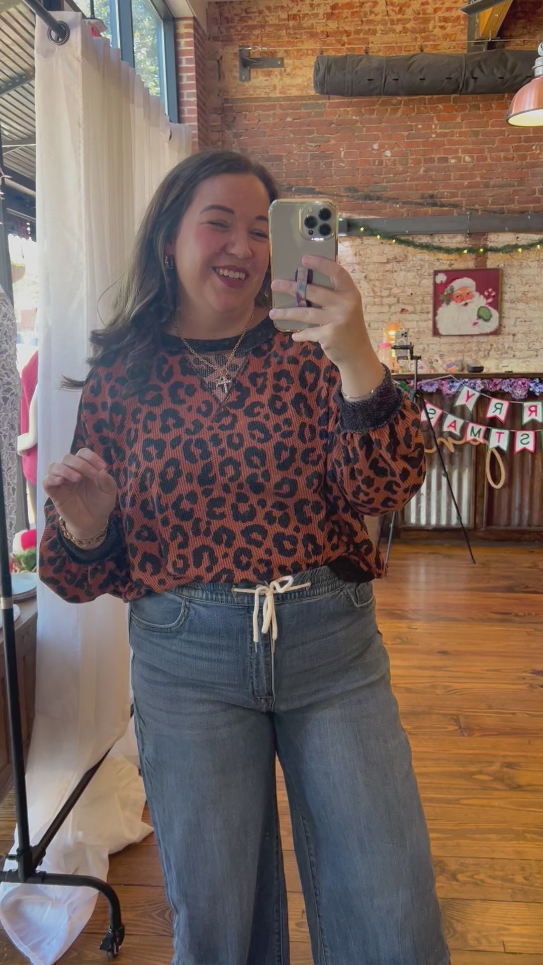 This top is giving cute, comfy, and confidently bold all at once. The warm cinnamon-and-black leopard print pops just enough to make a statement, and the soft knit makes it an easy all-day wear. With its relaxed fit, ribbed trim, and effortlessly cool vibe, this is the kind of top you throw on when you want to look put together… even if you’re just running errands or hanging out at the shop.