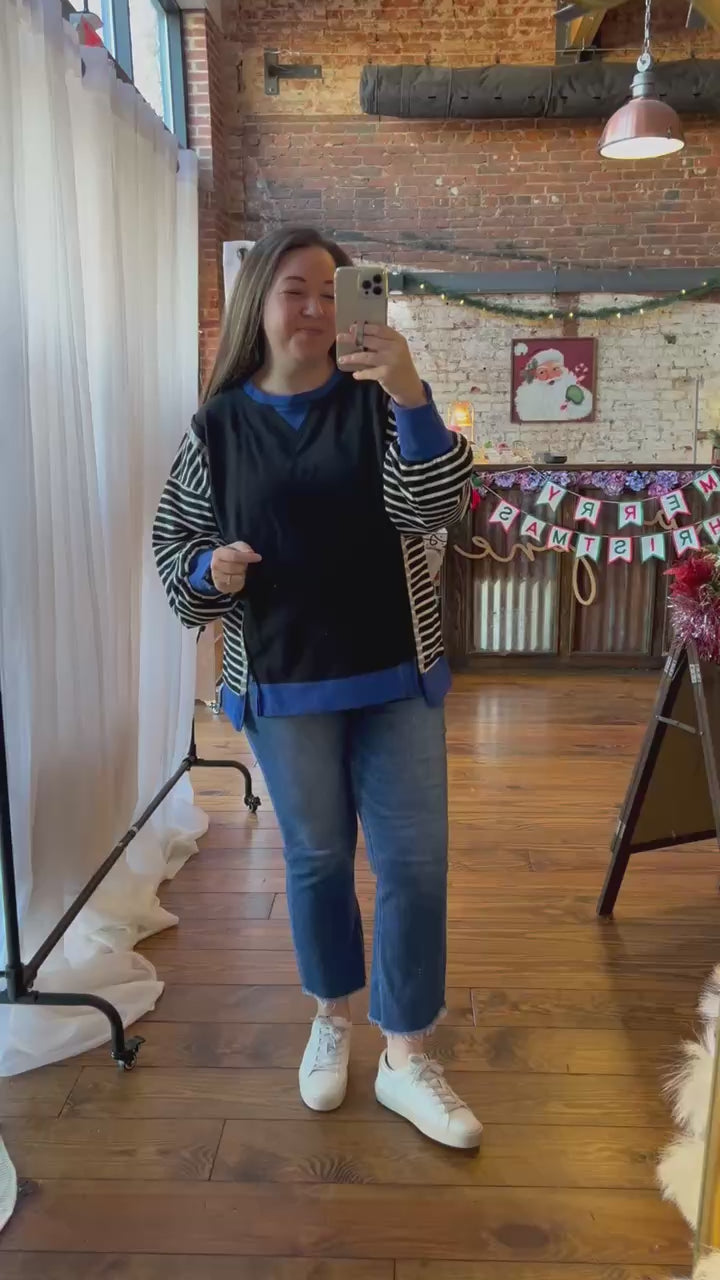 Meet the sweatshirt that refuses to be boring. The Bold Moves Sweatshirt mixes solid black with graphic stripes and that striking cobalt trim—giving you a look that’s casual, creative, and a little bit edgy in the best way.